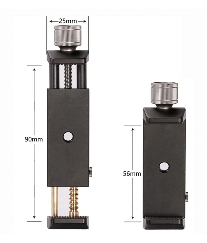 Pinza universal para teléfono smartphone con rosca 1/4 Leofoto PC-90. Hecha en aluminio aeronáutico. Apertura de 56 a 90 mm ajustable y bloqueable. Tiene 2 entradas para tornillo 1/4. Peso de 60 gramos.