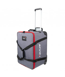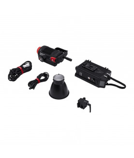 Incluye cabeza 1500W con monturas Bowens/Aputure y horquilla manual, reflector medio 35º, control DMX, cable a cabeza de 15m, cable alimentación AC de 6m, carro con ruedas y maleta de transporte con ruedas.