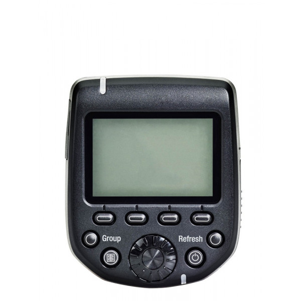 | Indicadores y controles | Pantalla con display LCD: Modo de sincronización, grupo, canal, activación ODS (solo Canon), activación Hi-Sync (HS), activación High Speed Sync (HSS), modo de disparo, indicador batería, nombre del flash, ID del flash, potencia del flash, nivel de lámpara de modelado. Botones: Selección de grupo, test, rueda giratoria para cambio de valores, confirmación, on/off y refresco. Hay también 4 botones con funciones variables: potencia +/-, lámpara de modelado off/prop/libre, selección individual de unidades y ajuste en el tablero. Menú arriba, menú abajo y salida. |