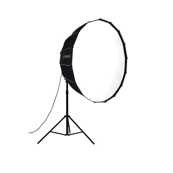 Con 120 cm de diámetro, su estructura está soportada por 16 varillas de acero. Su superficie interior reflectante en plata potencia la salida de luz, y sus dos difusores interno y externo son extraíbles. Este softbox parabólico genera una luz suave con bordes definidos, con apariencia de luz natural, idóneo para sesiones de retrato y moda.
