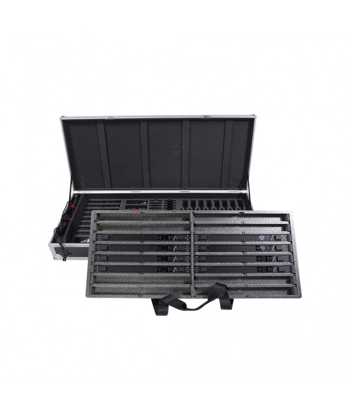 Incluye 8 barras 60cm 14W con imanes y batería integrada, 8 cables adaptadores 48W DC, 8 cables alimentación 1.5m, 1 cable alimentación 4m, 1 splitter alimentación de 8 salidas, 16 separadores de imán, 8 pinzas INFINIBAR con espárrago 16mm, 8 conectores rectos, 1 llave hexagonal 5mm, 8 eggcrates 45º y maleta con ruedas de transporte. Datos fotométricos a 5600K: 1.026 Lux a 0.5m, 317 a 1m.