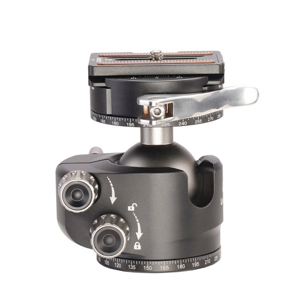 Rótula de bola LH-40PCL de Leofoto. Bola de precisión de 40mm de diámetro. Con bloqueo y liberación de palanca y rotador panorámico incluido. Incluye zapata extraible tipo Arca Swiss. Mando de presión, Mando de bloqueo y Mando panorámico independientes. Base de 57 mm. Altura de 90 mm. Entrada base 3/8. Tornillo sin fin. Soporta hasta 30 Kg. Peso de 560 gramos